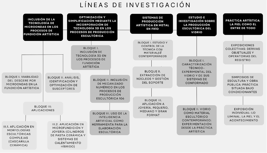 Sus principales líneas de trabajo abarcan la fundición artística, los procesos térmicos, la fabricación digital, la impresión 3D, el mecanizado CNC, la producción escultórica en vidrio y la práctica artística como espacio de investigación. Especial relevancia tienen las investigaciones sobre el uso de microondas en fundición y la incorporación de tecnologías digitales a procesos tradicionales, favoreciendo sistemas de trabajo más sostenibles, seguros y eficientes.